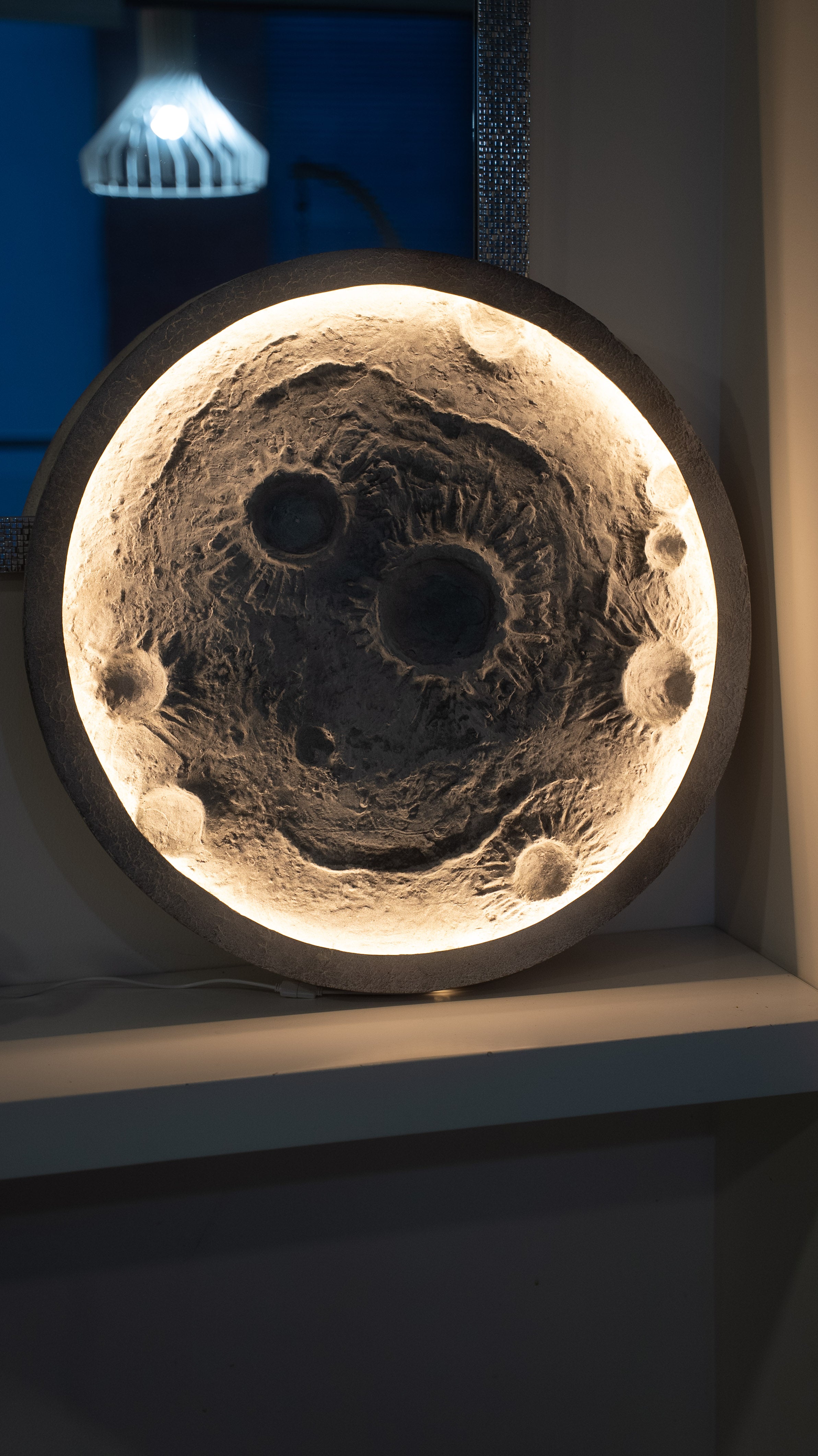 Cada escultura LUNOR está elaborada conresina lunar de alta resistencia, aplicada sobre una base deMDF premium, y reforzada confibras técnicas y resinas sintéticasseleccionadas por suestabilidad, ligereza y durabilidad. Este conjunto de materiales permite recrear con precisión la textura cratérica de la superficie lunar, logrando un acabado realista sin comprometer la resistencia ni el peso de la pieza. Finalmente, cada obra es protegida con unacúpula de vidrio templadoque resguarda su detalle artesanal y realza su presencia como una pieza de arte lumínico.